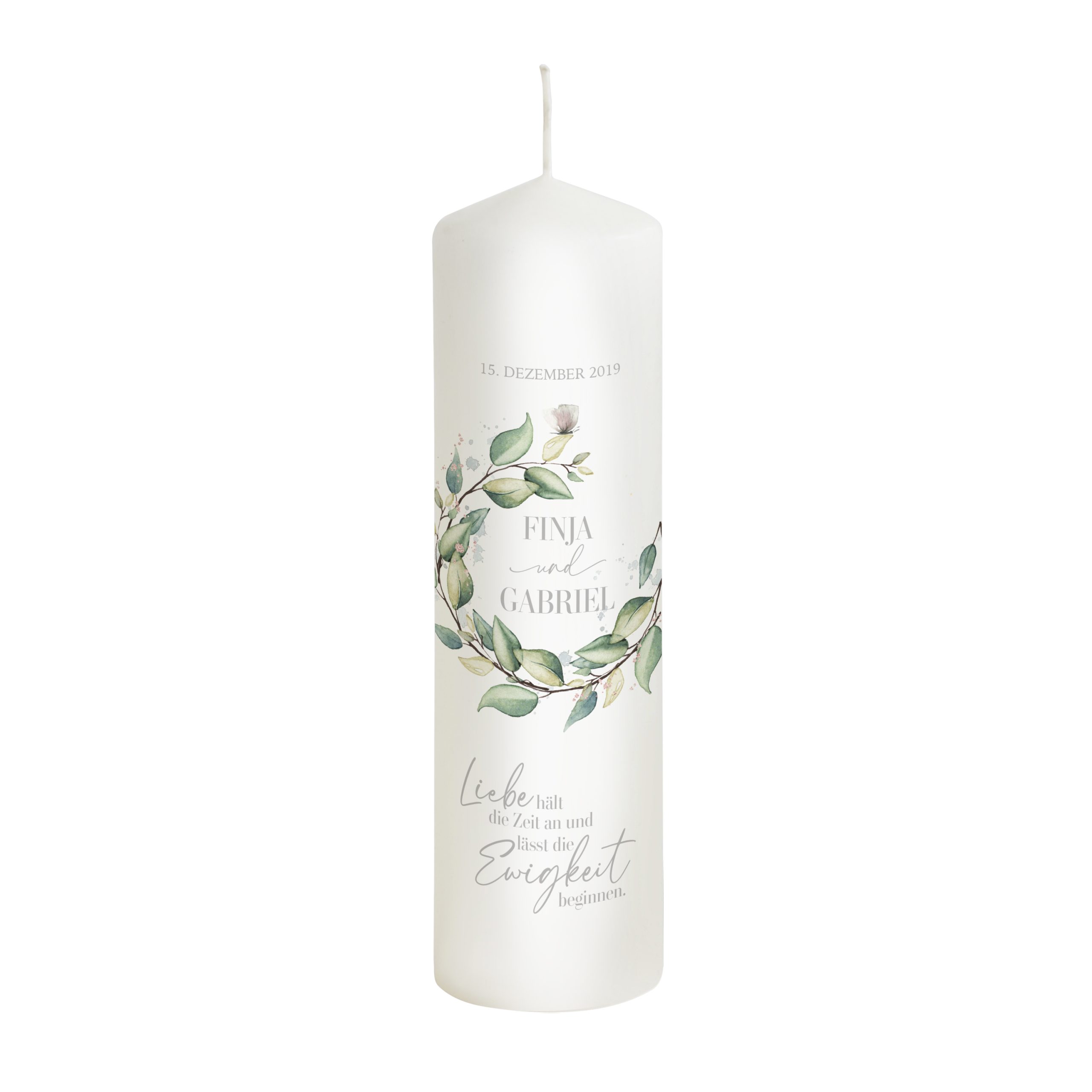 Die Hochzeitskerze Eukalyptus „Ewigkeit“ wird auf Wunsch liebevoll personalisiert mit: