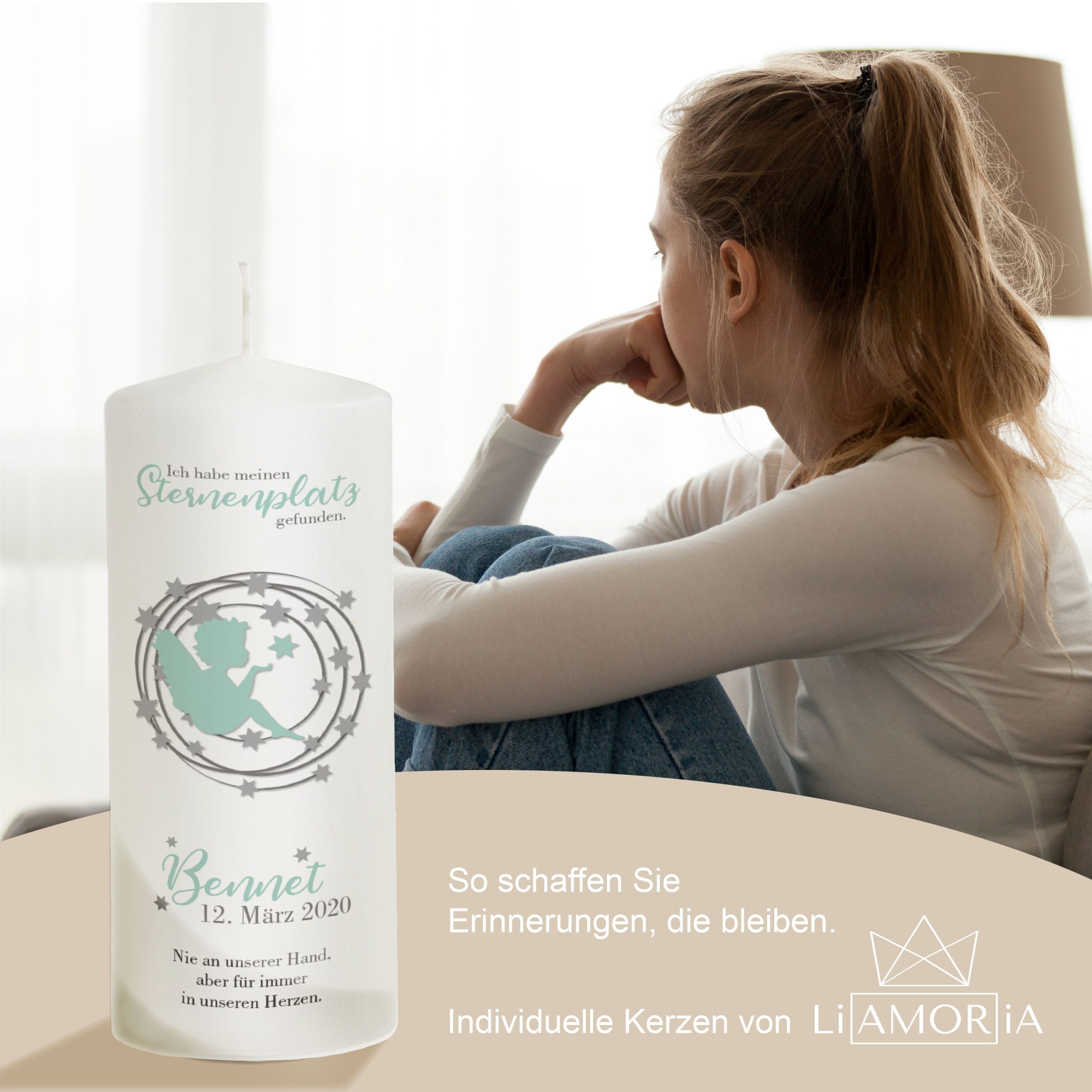 Die 20-cm-Variante wurde für Eltern gestaltet, die ein Sternenkind, ein Baby oder einen kleinen Jungen verloren haben und ein kleineres, handlicheres Erinnerungslicht für den Alltag wünschen. Sie eignet sich ideal für Gedenkplätze zuhause oder kleine persönliche Rituale.